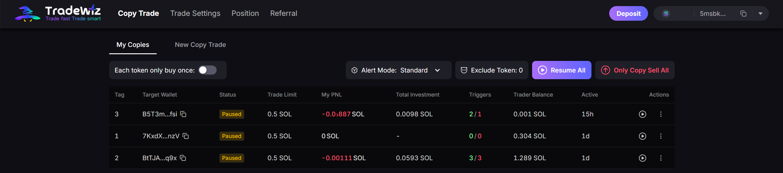 Copy trading data on TradeWiz Web and the Telegram Bot platform are synchronized in real time. Whether a Copytrade task is created or managed on the Web or TG Bot platform, it can be viewed, modified, and managed on the other platform, ensuring data consistency across both platforms. The data synchronization is bidirectional and real-time, guaranteeing immediacy and consistency of operations.