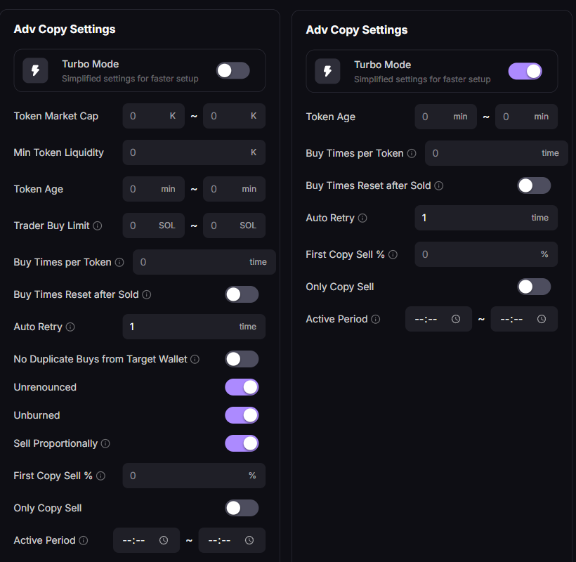No Duplicate Buys from Target Wallet: After the user enables copy trading and 'No Duplicate Buys from Target Wallet', if the trader has already purchased a token and later buys the same token again, the user will not copy the purchase of that token