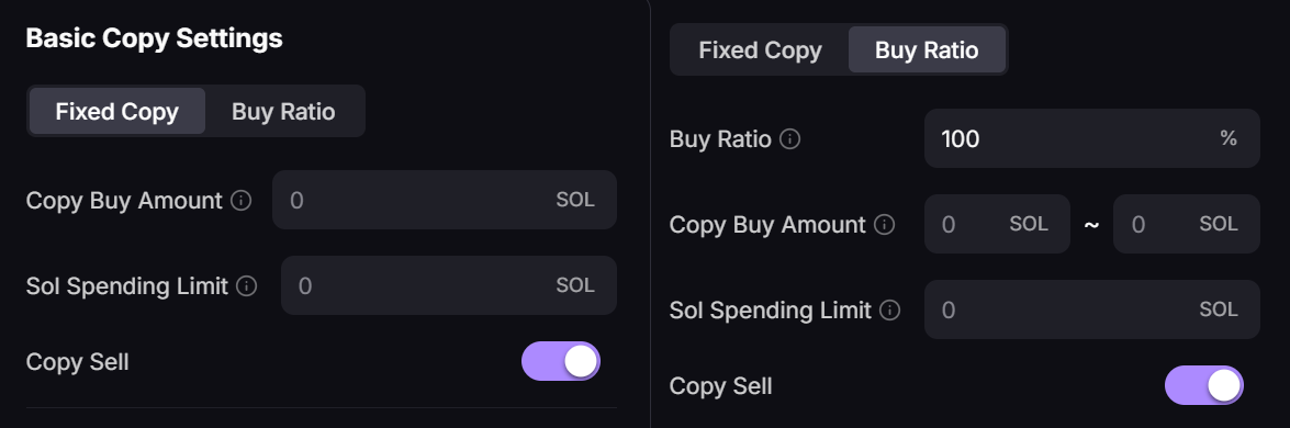 Buy Ratio: you buy amount = the copied wallet buy amount × the percent you had set