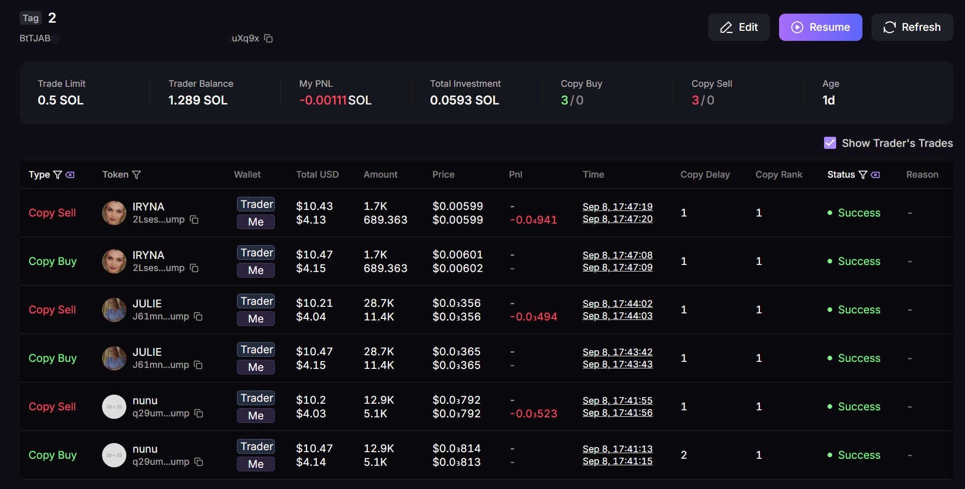 Ritardo Copia | Mostra il numero di blocchi ritardati per il copy trade relativo al trader originale. | |